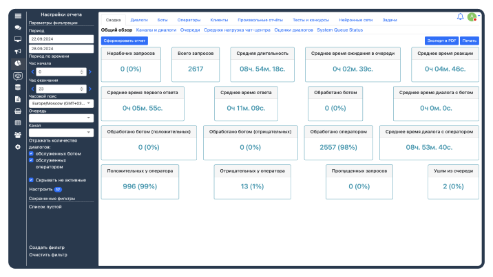 Собирайте и анализируйте данные полученные по диалогам прямо на нашей платформе! Существуют как преднастроенные отчеты, так и возможность собирать собственные.