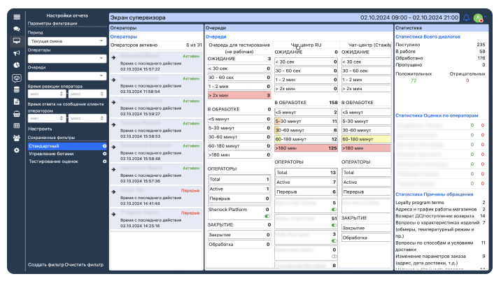 Позволяет мониторить чат-центр в реальном времени. Включает в себя список активных операторов, очереди, статистику, управление чат-ботами и упоминаниями.